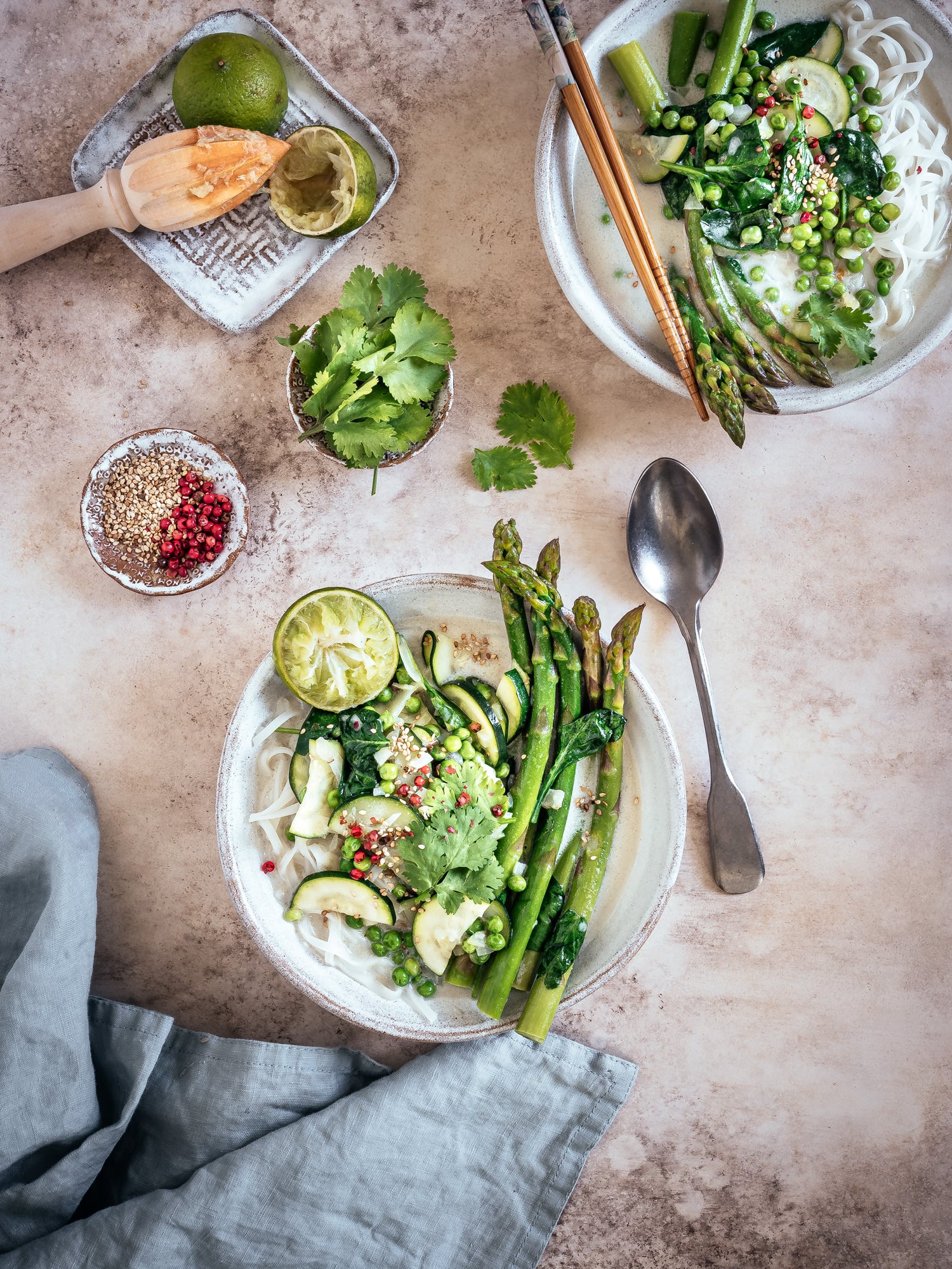 Anstelle der weißen Reisnudeln kannst du fast jede Art von Nudeln verwenden. Meine Favoriten für die grüne Spargelsuppe sind Udon, braune Reisnudeln oder Soba.