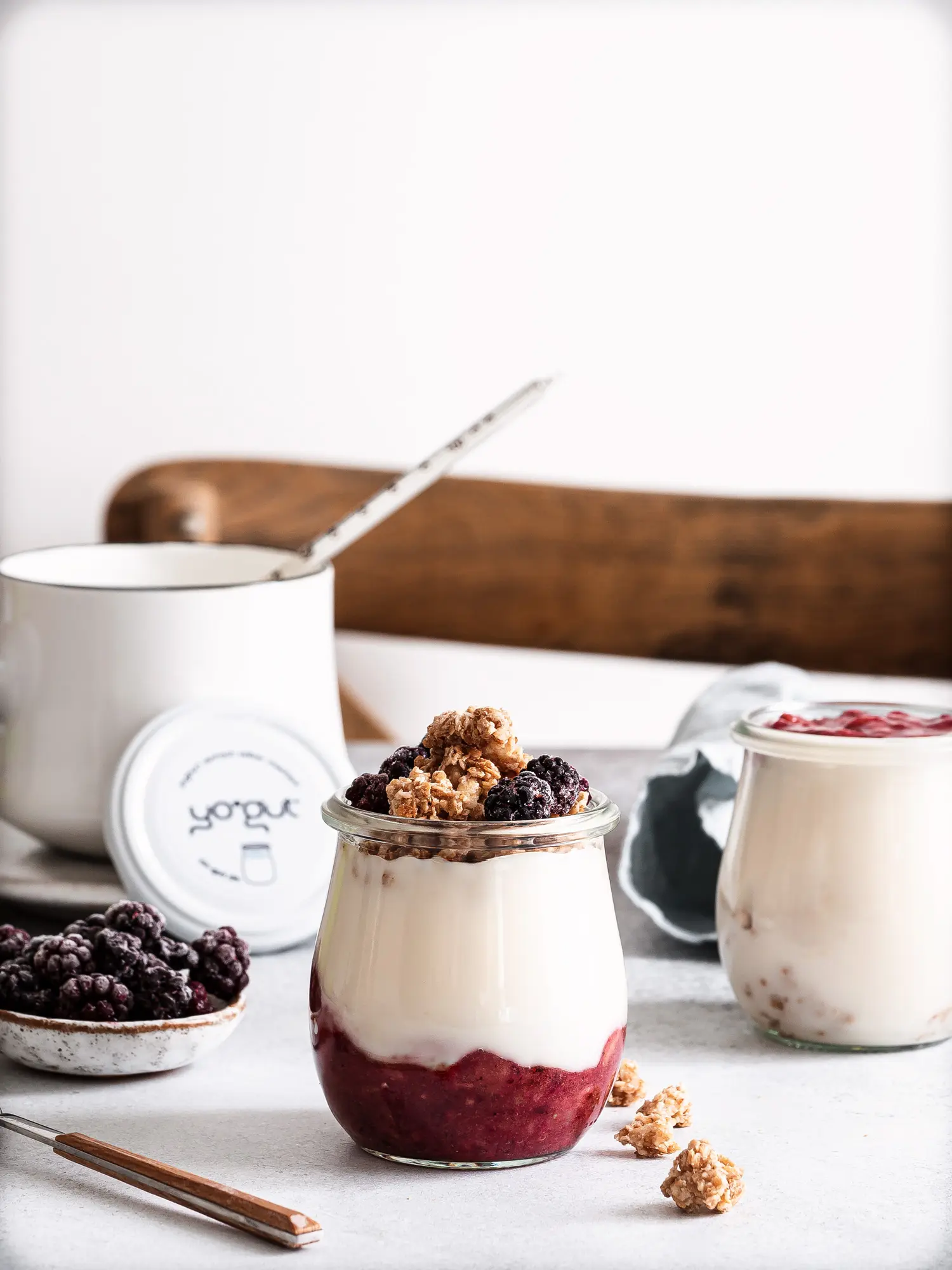 Eine meiner liebsten Kombinationen momentan sind definitiv Brombeerkompott und Joghurt. Es ist ja noch keine Beerenzeit, daher verwende ich tiefgekühlte, wilde Brombeeren. Die sind unglaublich aromatisch im Geschmack und passen perfekt zu der Frische des Joghurts. Du kannst aber jede Beere verwenden die du magst und auch einfach deine liebsten Sorten mischen.