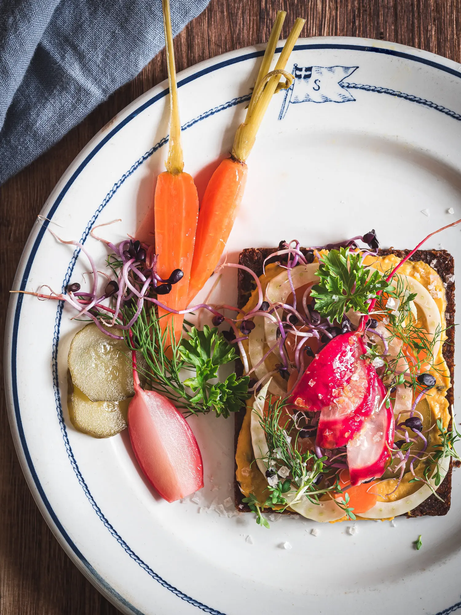 Smørrebrød mit Koriander Radieschen, Salz-Dill Möhren & Hummus